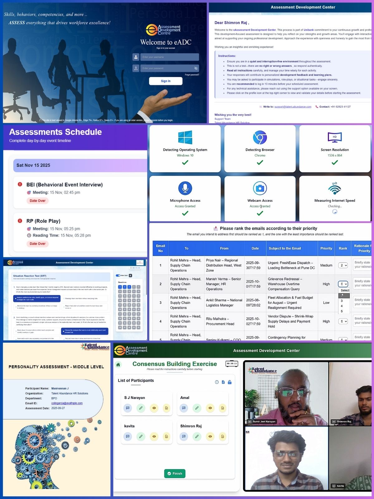 eADC is a next-generation, AI-powered, SaaS-based platform purpose-built to replicate the Assessment & Development Center experience in its most authentic form. Far beyond traditional online tools focused solely on psychometric or aptitude testing, eADC delivers a comprehensive, high-fidelity simulation of a full-scale ADC – virtually, seamlessly, and on-demand. Leveraging advanced AI capabilities, it enables organizations to assess employees, candidates, or exiting members with the same depth, rigor, and behavioral observation as an in-person center, anytime and anywhere.